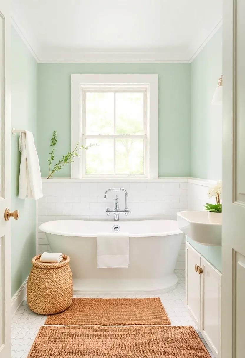 Transform your small bathroom into a serene haven by embracing the soothing palette of seafoam green and crisp white. This combination echoes a seaside retreat, where the gentle waves mix seamlessly with the soft sand. Painting your walls a tranquil seafoam green creates a sense of depth and calm, while bright white accents — from the trim and cabinetry to the bath linens — keep the space feeling airy and fresh. Consider adding elements such as a white freestanding bathtub or a sleek glass shower enclosure to enhance the modern appeal of this color scheme.