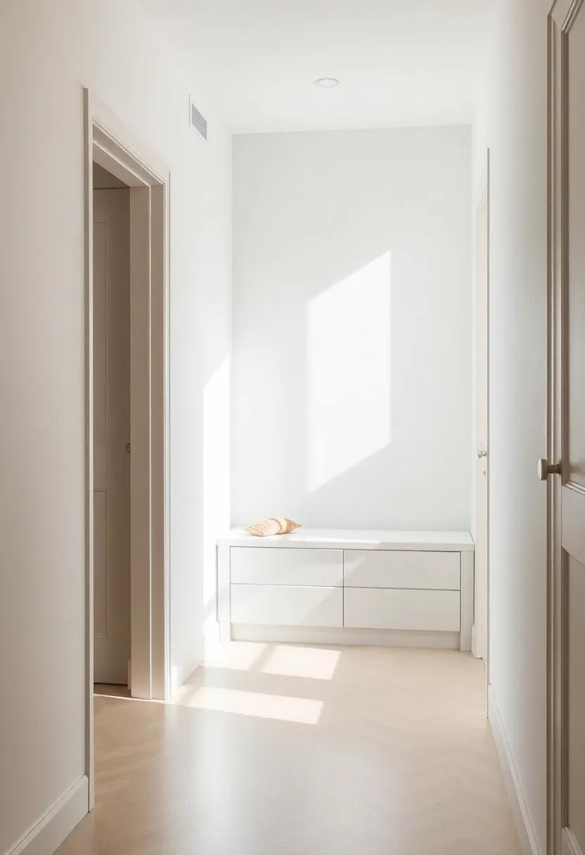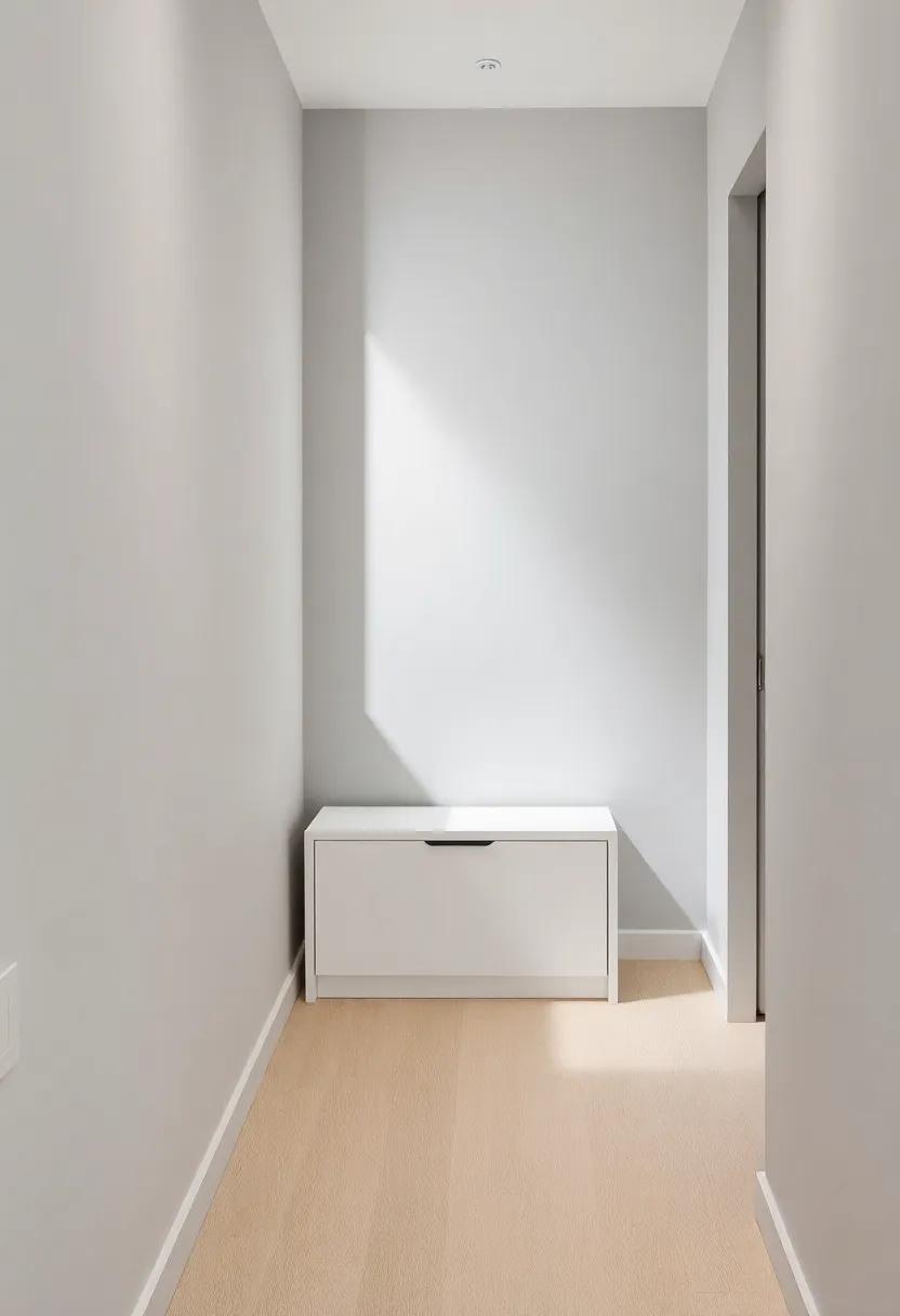 “Chic Minimalism: A sleek white sliding storage bench effortlessly blends into a narrow hallway against a backdrop of soft gray walls, providing both storage and a modern aesthetic.”