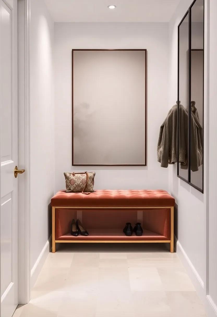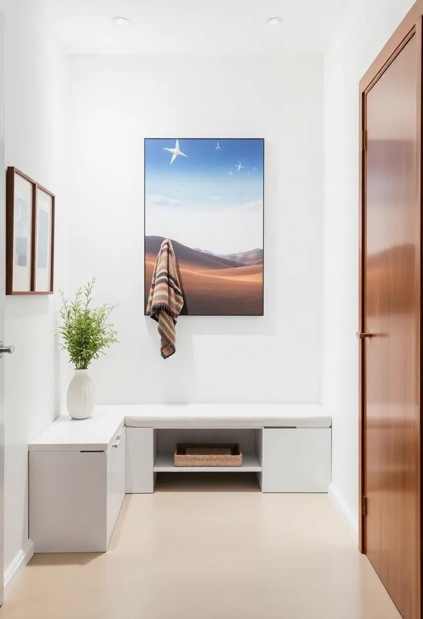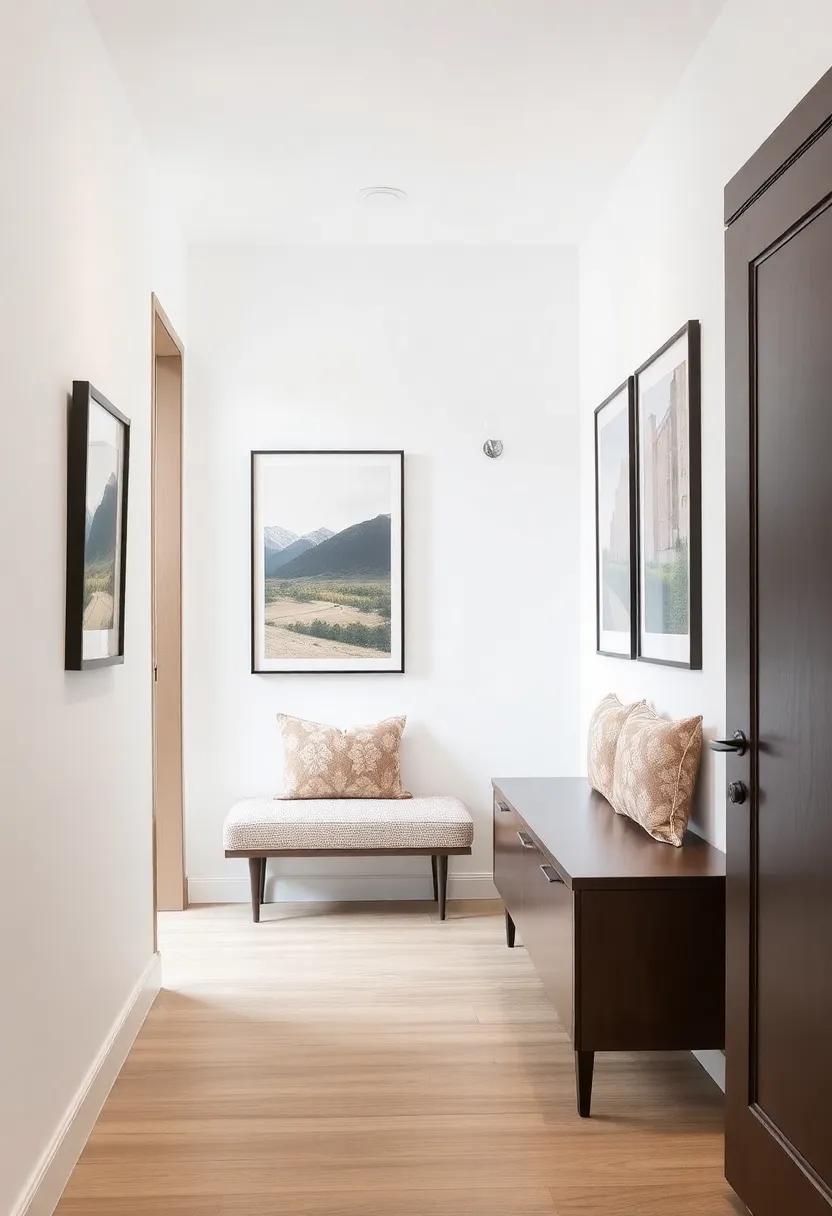 “Gallery Style: Transform a small hallway into an art gallery by pairing a slim sliding storage bench with framed prints, creating an inspiring and functional display.”