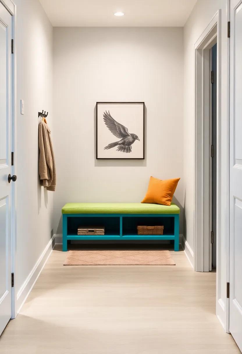 “Color Pop: A vibrant teal storage bench injects life into an otherwise neutral hallway,serving as both a statement piece and a practical solution for organization.”