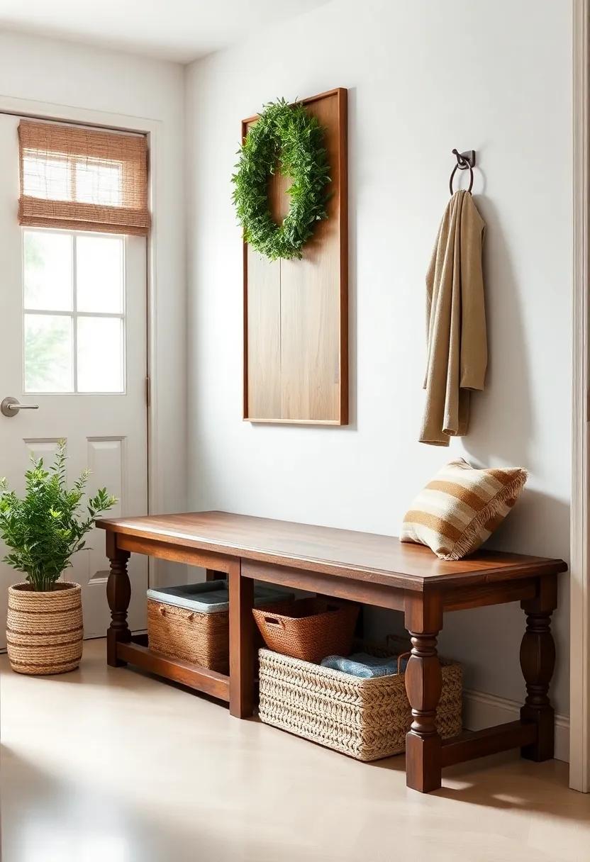 “Nature-Inspired: Incorporate a sliding storage bench made from bamboo into your hallway decor, offering eco-friendly storage that complements indoor plants.”