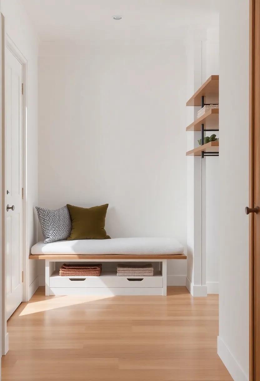 “Zen Retreat: A minimalist sliding bench adorned with cushions creates a serene vibe in your hallway, perfect for moments of calm amidst a busy home.”
