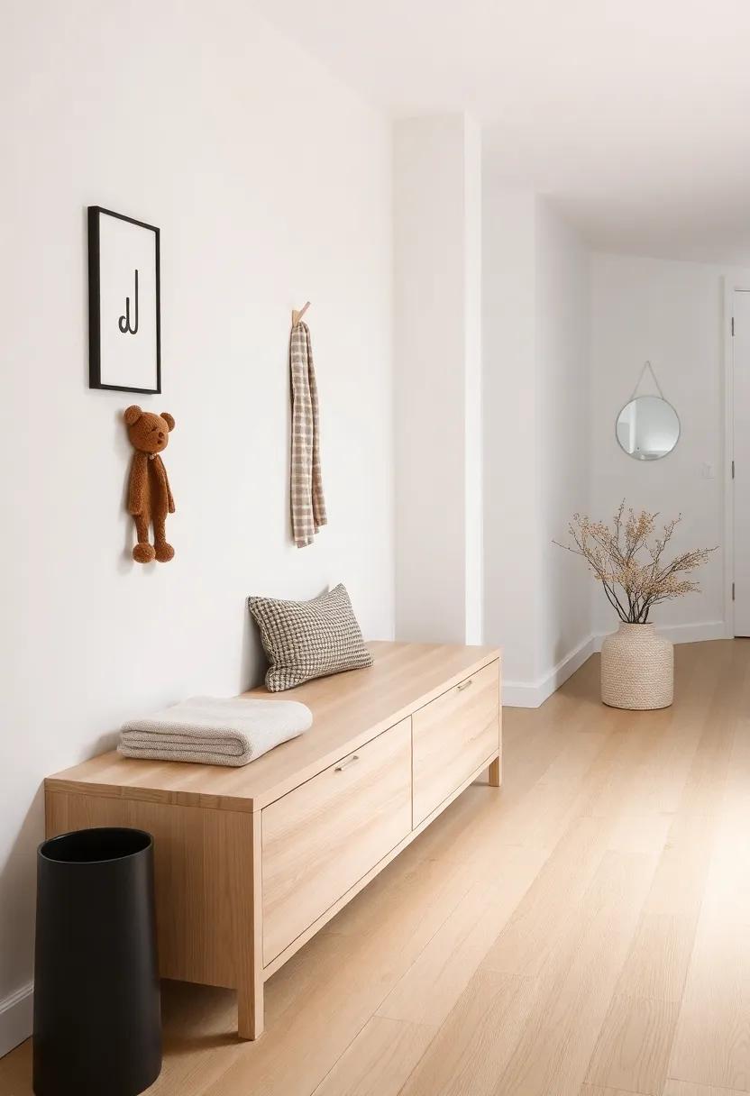 “Scandi Simplicity: A light wood sliding storage bench with simple lines reflects the Scandinavian design ethos, providing organization without overwhelming a small space.”