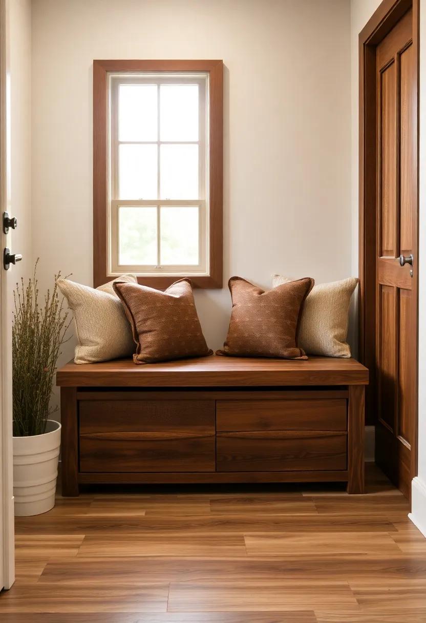 “Rustic Charm: Embrace warmth with a reclaimed wood sliding storage bench adorned with cozy cushions, perfect for adding personality to a rustic-themed hallway.”