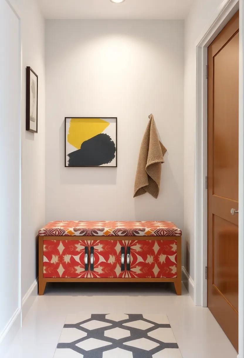 “Bold Patterns: A patterned fabric sliding storage bench adds a playful touch to the hallway, harmonizing fashion and function for an eclectic look.”