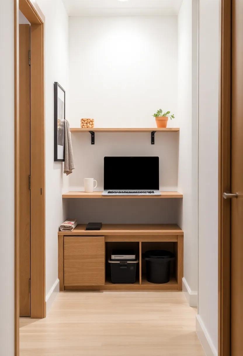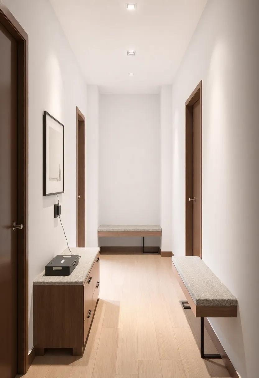 Imagine transforming a narrow hallway into a synergistic space where organization meets functionality. A sliding storage bench with a fold-down top not only provides seating but also cleverly conceals a workspace. When you want to tackle quick tasks or manage your schedule, simply pull down the top to reveal a dedicated surface that can accommodate a laptop or a few essential office supplies. This seamless integration allows you to maintain the flow of your home while offering an efficient area for productivity.