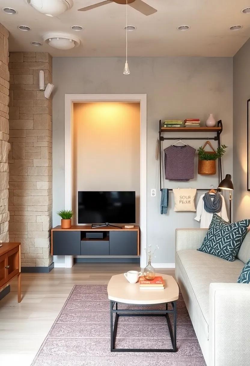 Explore tailored solutions that fit your unique lifestyle and size restrictions. You can even use simple structures such as a DIY ceiling-mounted grid to hang baskets or hooks, allowing you to customize and reconfigure your storage as needed. With these innovative approaches, you not only declutter your living area but also create a stylish and functional surroundings.