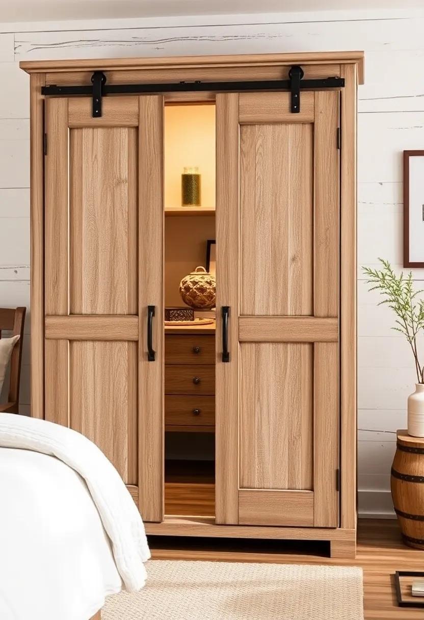 Farmhouse Style: Find comfort in a wardrobe that embodies rustic charm with sliding barn doors, shiplap details, and a distressed finish, creating a warm, inviting atmosphere