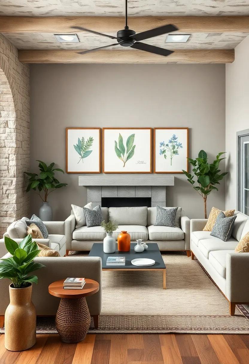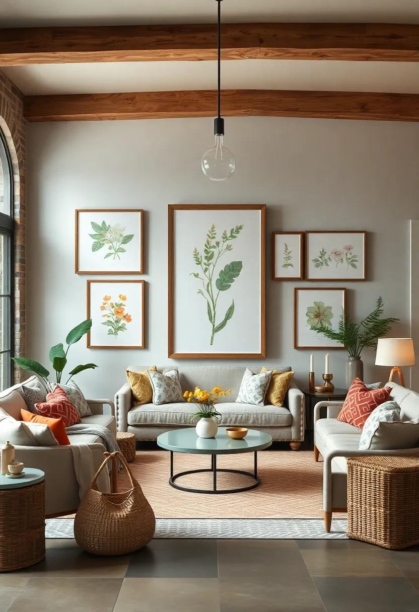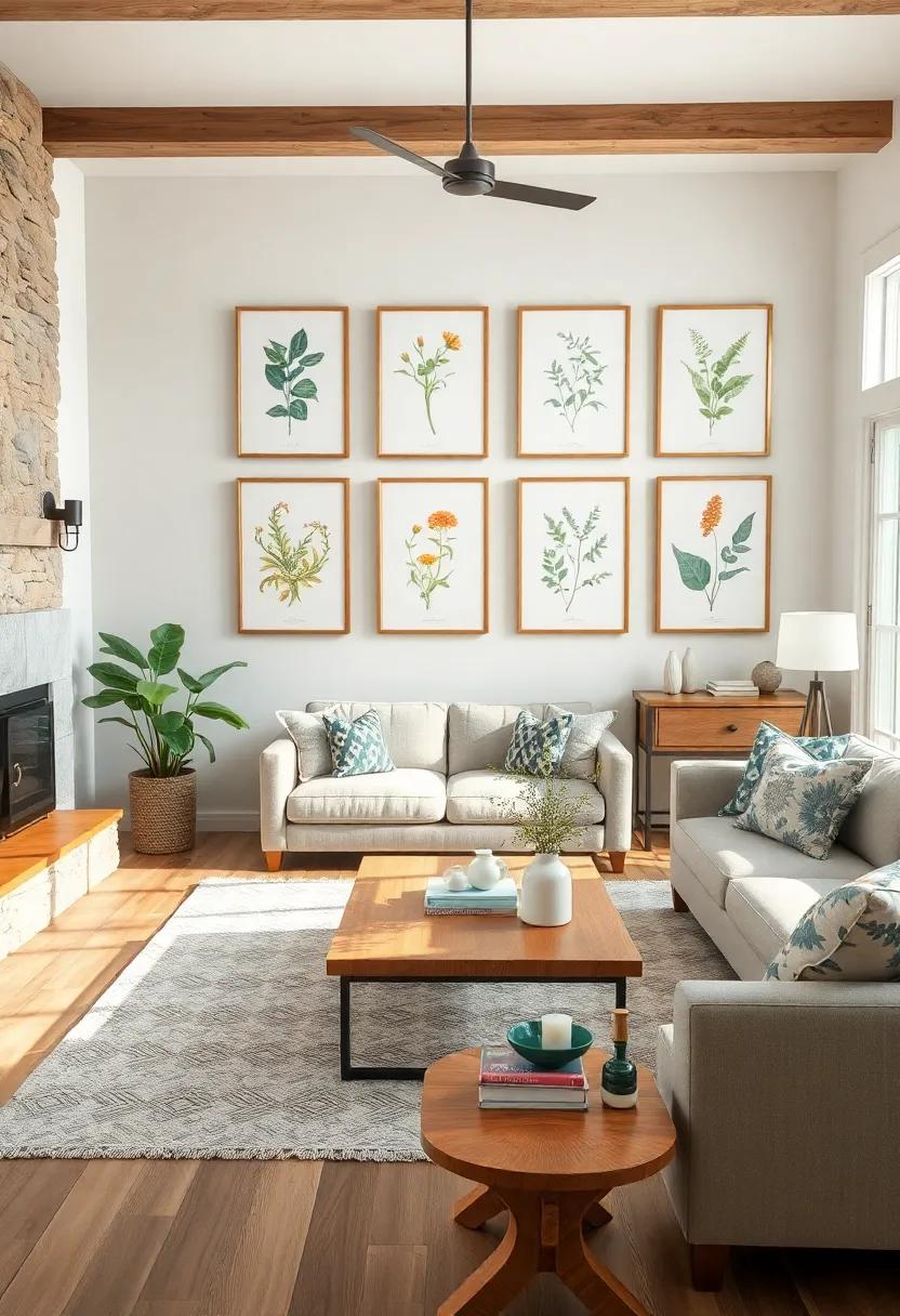 Another fabulous option is to showcase botanical prints alongside abstract art that incorporates organic shapes and earthy tones. Abstract pieces can provide a contemporary twist, making the space feel both modern and inviting. To enhance this pairing, think about arranging the artwork in a gallery wall format, mixing both styles in a way that draws the eye without overwhelming the senses.Below is a simple layout idea:
