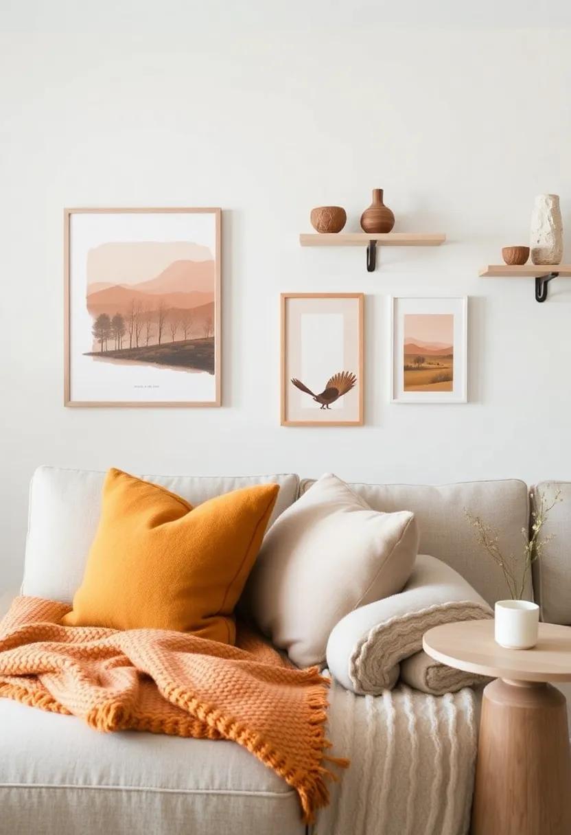 Along with textiles, wall art is a fantastic way to infuse warmth into your decor. Choose pieces that reflect natural landscapes or abstract designs in warm tones, bringing a sense of vibrancy to the walls without overwhelming the senses. Consider creating a gallery wall with a mix of framed art and floating shelves displaying small ceramic or wooden sculptures. This combination will not only enhance the visual interest of your room but also provide a cozy and curated look that embodies the essence of Scandinavian style.
