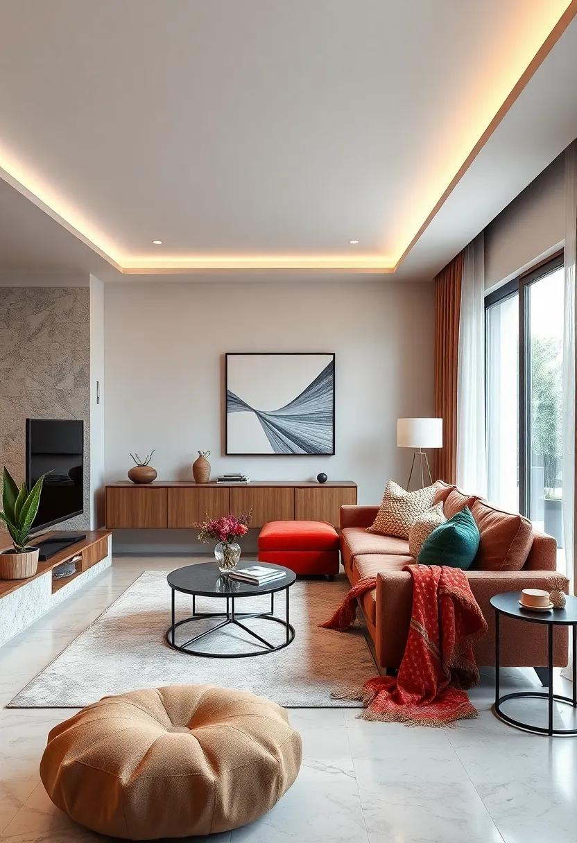To enhance the inviting atmosphere, consider incorporating elements that promote comfort and style. Layered textiles in the form of throw blankets and plush cushions can soften the edges of your floating arrangement. Combine this with various lighting sources, like floor lamps or table lamps, to create a warm ambiance. Include a stylish area rug to define the conversation zone, anchoring the furniture and adding a dash of personality to the space. Remember, your goal is to evoke a sense of togetherness without compromising on elegance, making your living room not just a space to live in, but a delightful area to entertain and connect.
