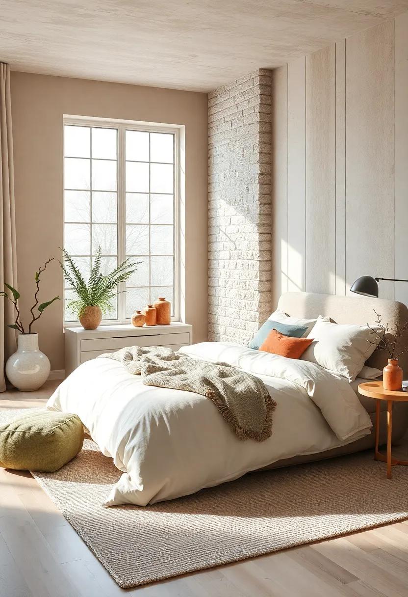 Organic Elements: Integrate indoor plants with neutral clay pots into your bedroom design, enhancing the calming atmosphere while bringing nature indoors for a revitalizing touch