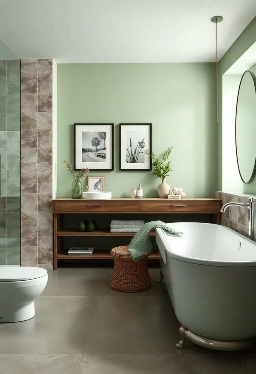 To elevate your sage green bathroom into a chic sanctuary, incorporate one or two bold accent pieces that draw the eye and stimulate conversation. Imagine a large, abstract artwork bursting with colors like deep teal or vibrant coral, serving as a striking focal point against the subtle hues of sage. This unexpected combination not only enhances the aesthetic but also creates a sense of depth and dimension in the space. Other options include decorative bowls made from materials like colorful ceramic or hand-blown glass—each piece adding a unique flair while still harmonizing with the overall calming atmosphere.