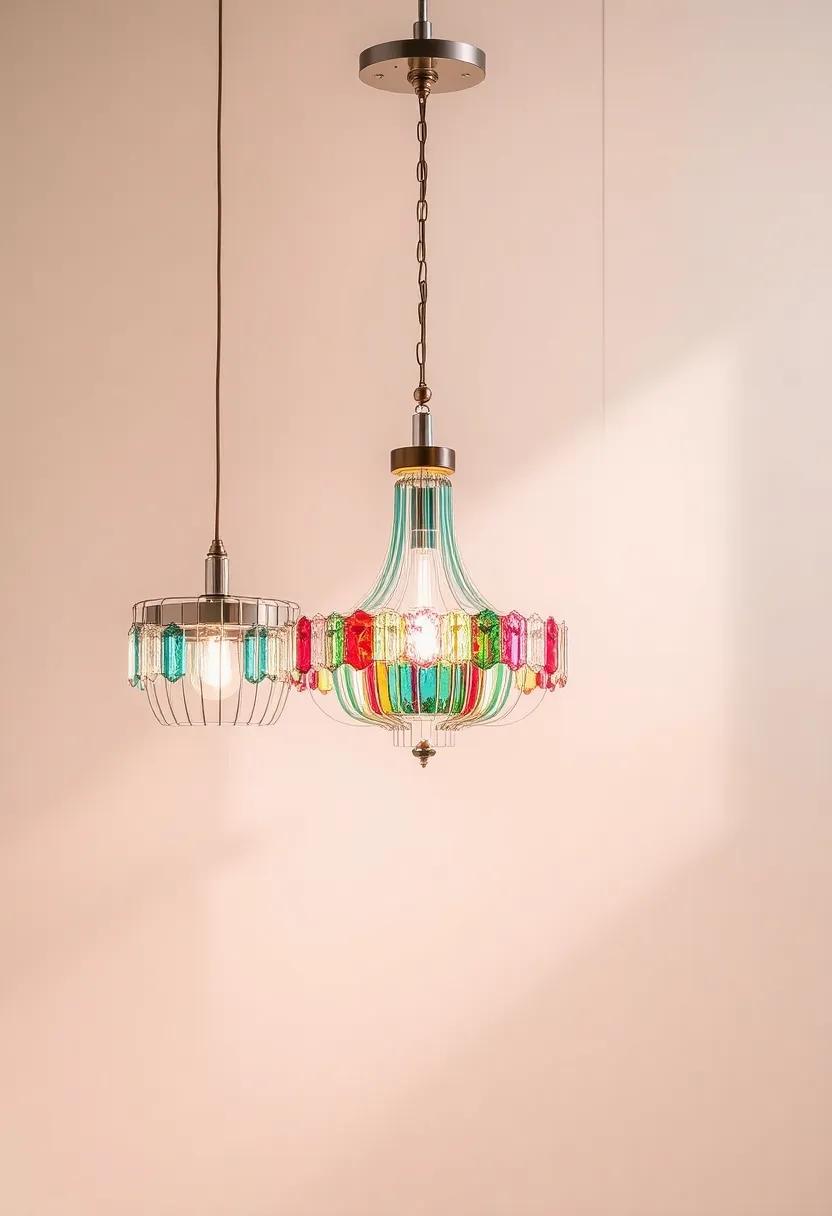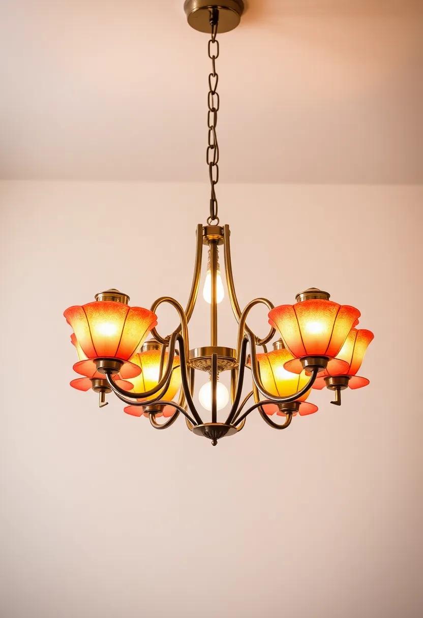 The “Vintage Glamour” chandelier, with its retro charm, features colorful glass shades that bring a playful pop to any space while nodding to the elegance of the 1920s