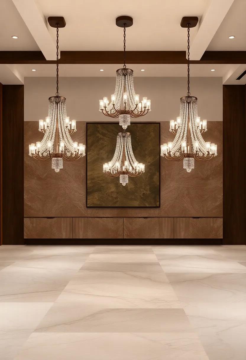 - Statement Furniture: Include plush velvet sofas and lacquered wood pieces to complement the chandelier’s grandeur.