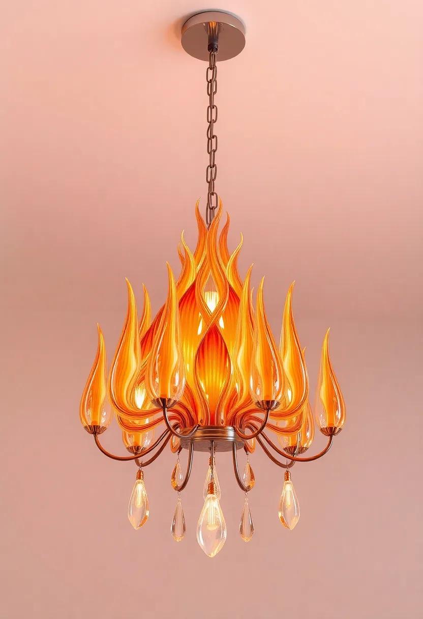 The mesmerizing chandelier captures the fiery essence of flames in a stunning display of craftsmanship.Each glass piece, artfully arranged, mimics the dynamic movement of fire, radiating warmth and elegance into any space. The light shines through the intricate glass forms, creating a delicate dance of shadows and illumination that transforms the atmosphere. With its unique design, it serves not only as a light source but also as a captivating piece of art that draws attention and admiration from all who enter the room.