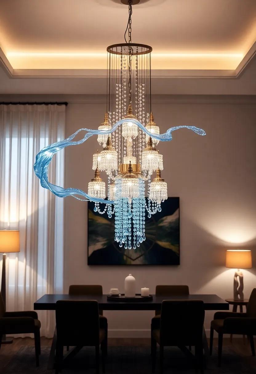 Transform any room with the “Aquatic Serenity,” a chandelier designed to emulate underwater scenes, complete with flowing shapes and shimmering blues