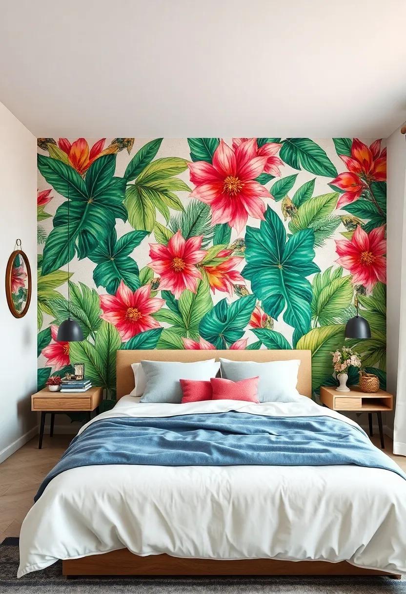 Infuse your bedroom with the exuberant energy of tropical botanicals by opting for a bold floral and leaf fusion that showcases an array of vibrant colors. Imagine waking up surrounded by sumptuous hues of tropical greens, deep blues, and fiery floral accents. A stunning wallpaper featuring oversized palm leaves and exotic blossoms can serve as the ultimate statement piece, drawing the eye and exuding a sense of paradise that transports you far from the ordinary. 🌺 Let your walls bloom with designs that celebrate nature’s bounty, presenting not only color but also the intricate details of lush foliage that brings your sleeping space alive.