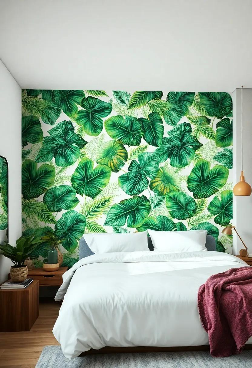 Choose a large-scale leaf wallpaper that creates a statement wall, making it the focal point of your bedroom with its bold design