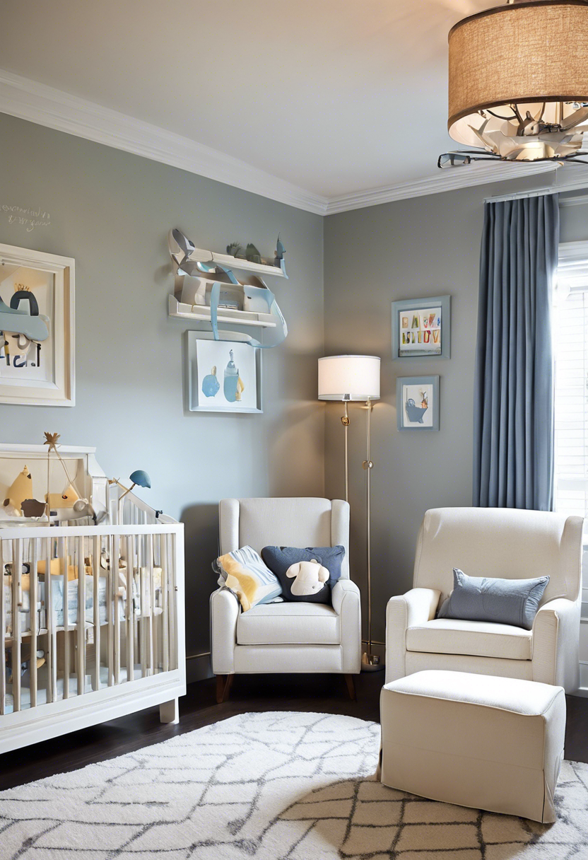 One whimsical way to design a baby boy nursery is by . These fun and engaging elements can stimulate the baby’s senses and encourage curiosity and exploration. Consider hanging a playful mobile above the crib with colorful shapes or animals that can be moved and rotated. Interactive toys such as soft rattles, plush animals with different textures, and musical toys can also provide entertainment and sensory stimulation for your little one.