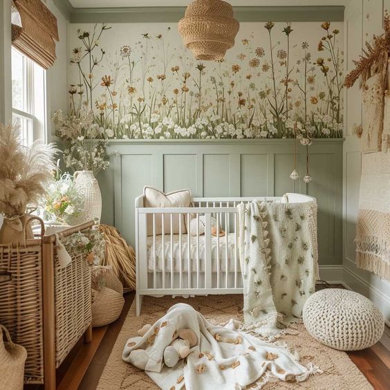 Create a whimsical jungle-themed nursery by placing potted plants such as ferns, palms, or succulents throughout the room. You can also hang macrame plant hangers from the ceiling or place plant stands next to the crib for a playful and natural look. Intertwine string lights with the greenery to add a magical touch to the space.