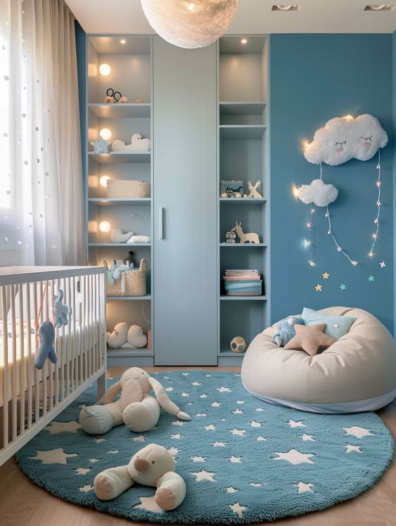 Embrace a soft color palette of pale blues, silvery greys, and touches of gold to evoke the dreamy atmosphere of a celestial nursery. These colors will create a soothing environment perfect for your little one to drift off to sleep under the stars.