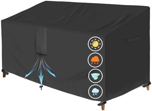 This outdoor furniture cover is crafted from heavy-duty fabric, ensuring durability and resistance against harsh weather conditions. With dimensions of 58″Wx32″Dx31″H, it provides comprehensive protection for a two-seater loveseat, safeguarding it from rain, sun, snow, and dust. The black color offers a sleek look while blending well with any outdoor decor. Additionally, the cover features an effective waterproof treatment, so your couch remains dry even during rainstorms. The air vent reduces condensation buildup inside, which can be a major concern for outdoor furniture.