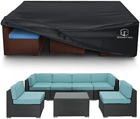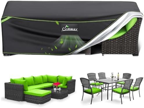 This reliable outdoor furniture cover is crafted from high-quality, tear-resistant 500D material, ensuring long-lasting durability against the elements. The waterproof construction and reinforced seams keep your patio set dry and protected from rain, snowstorms, dust, and falling leaves. With dimensions of 126”L x 63”W x 28”H, it accommodates 7-12 pieces of outdoor furniture, making it suitable for larger sectional sofas and dining sets. The clever full coverage design effectively shields your furniture from harmful UV rays, helping maintain its pristine appearance over time.