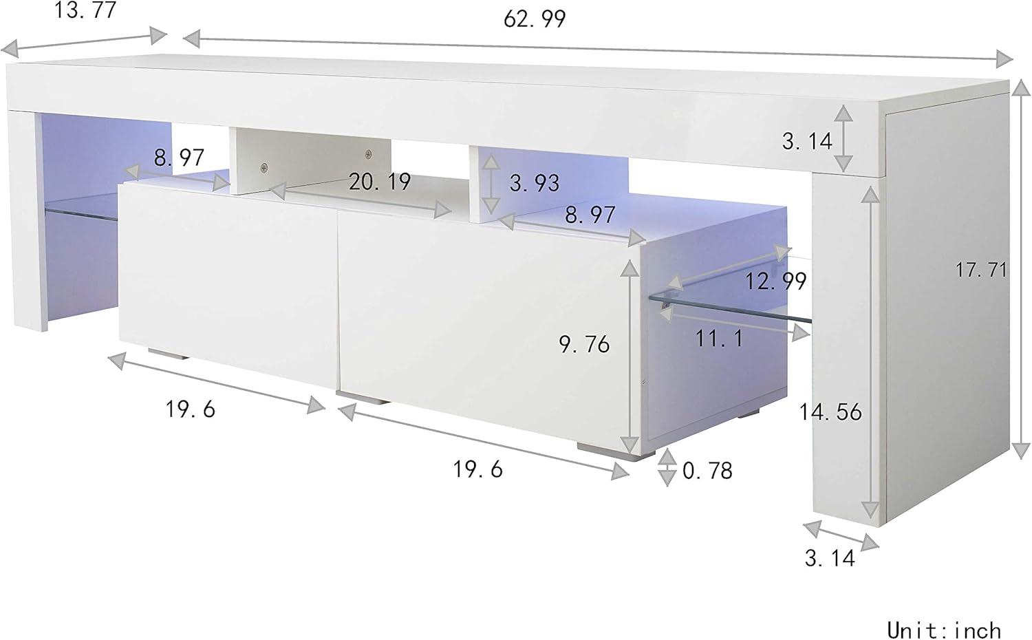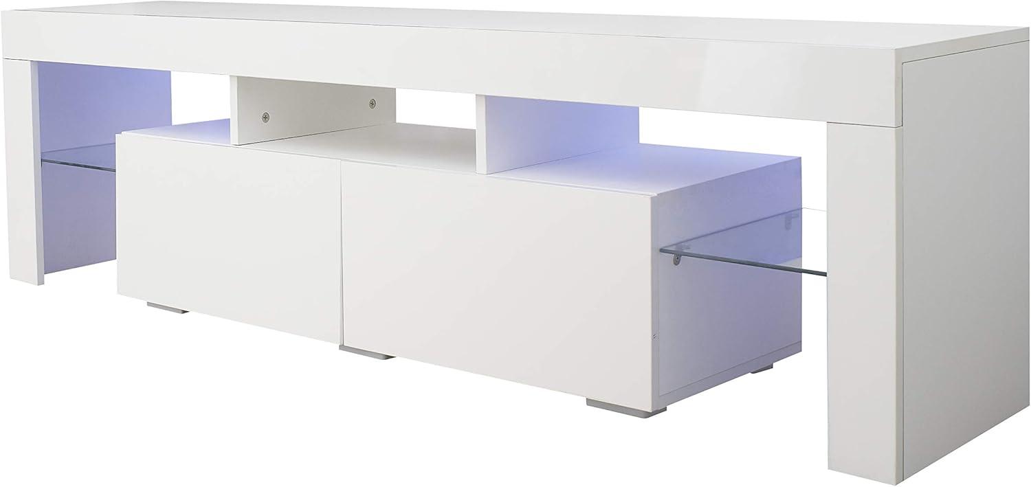 When you first set the stand in place, it reads immediately as part of the room’s foreground — a low, horizontal anchor that draws the eye along the wall. In bright daytime the white finish takes on whatever color palette is already in the room,while in dimmer light the built‑in LEDs introduce a soft band of color that changes the atmosphere without asking for attention. You find yourself doing small, automatic things around it: angling the TV a hair, tucking a cable behind a panel, or resting the remote on one corner while you settle in.Up close the seams, handles and light strip are the details you notice first; from the couch the unit mostly becomes background to what’s on screen and to the way light plays off nearby surfaces.