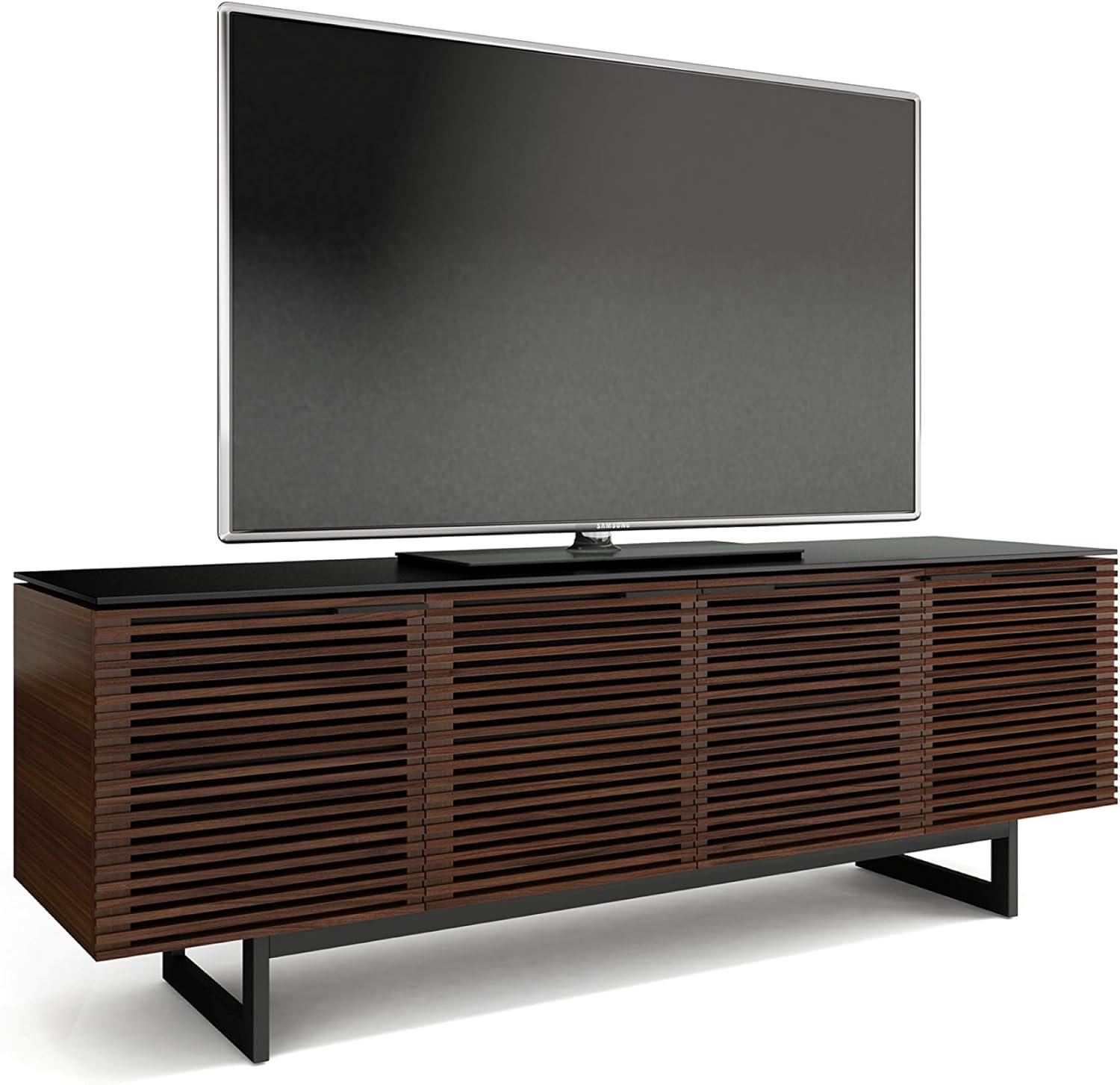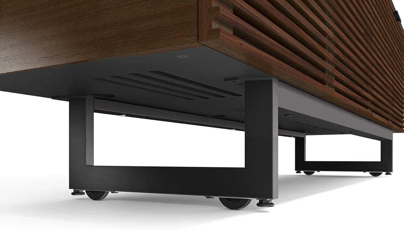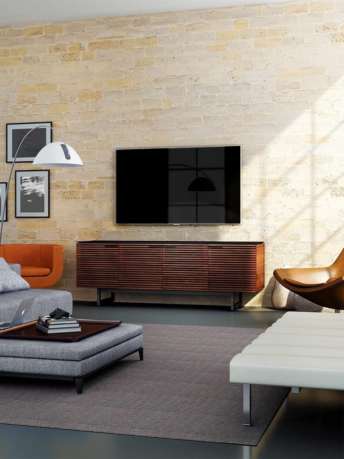 You notice how afternoon light picks out the chocolate-stained walnut and makes the louvered front throw narrow bands of shadow across your rug. Up close the finish is warm under your hand, the grain clear but subdued, and the piece reads heavy and horizontal the moment you step into the room.BDI’s Corridor 8179 sits low beneath your screen, the slatted doors offering a quiet friction when you slide them and a shallow ledge above that catches a slim soundbar without fuss. It settles into the living space more like furniture than electronics—tactile, steady, and quietly present.