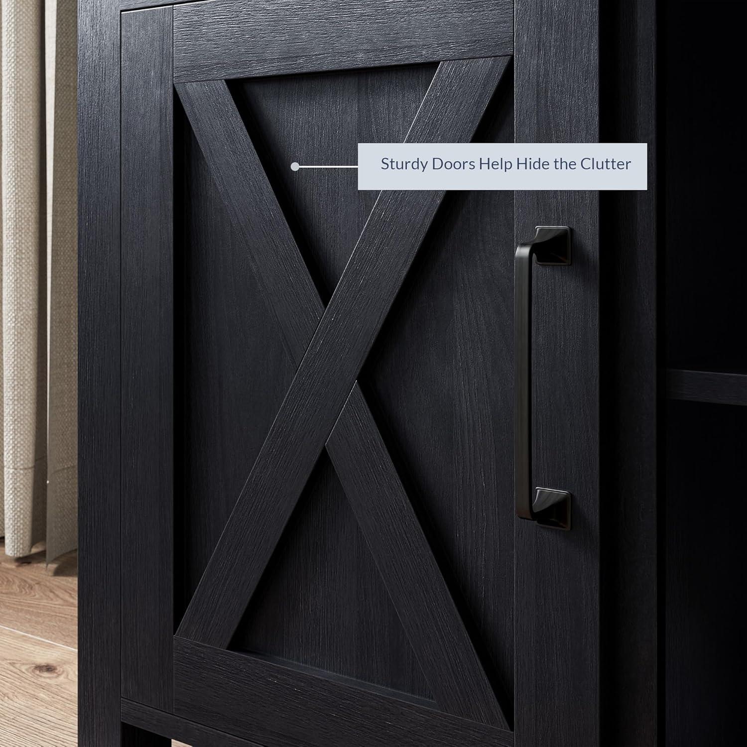 The day‑to‑day rhythm becomes apparent quickly — you reach for remotes and media from the open shelves while the barn‑style doors are usually shifted partway to conceal clutter. The doors slide on external rails and can be moved with one hand once the track is settled, though they can feel stiff at first and occasionally need a fast readjustment if dust builds in the groove. Opening one door reveals roughly half of the cabinet space, so accessing items stored behind the other door sometimes requires sliding it fully across; leave cords with a little extra length so a plugged device won’t pull tight when the door moves.small observations in routine use: check screws every few months, wipe dust from the door track, and free up shelf space before trying to reposition adjustable shelf pins — those minor actions keep daily access simple and predictable.