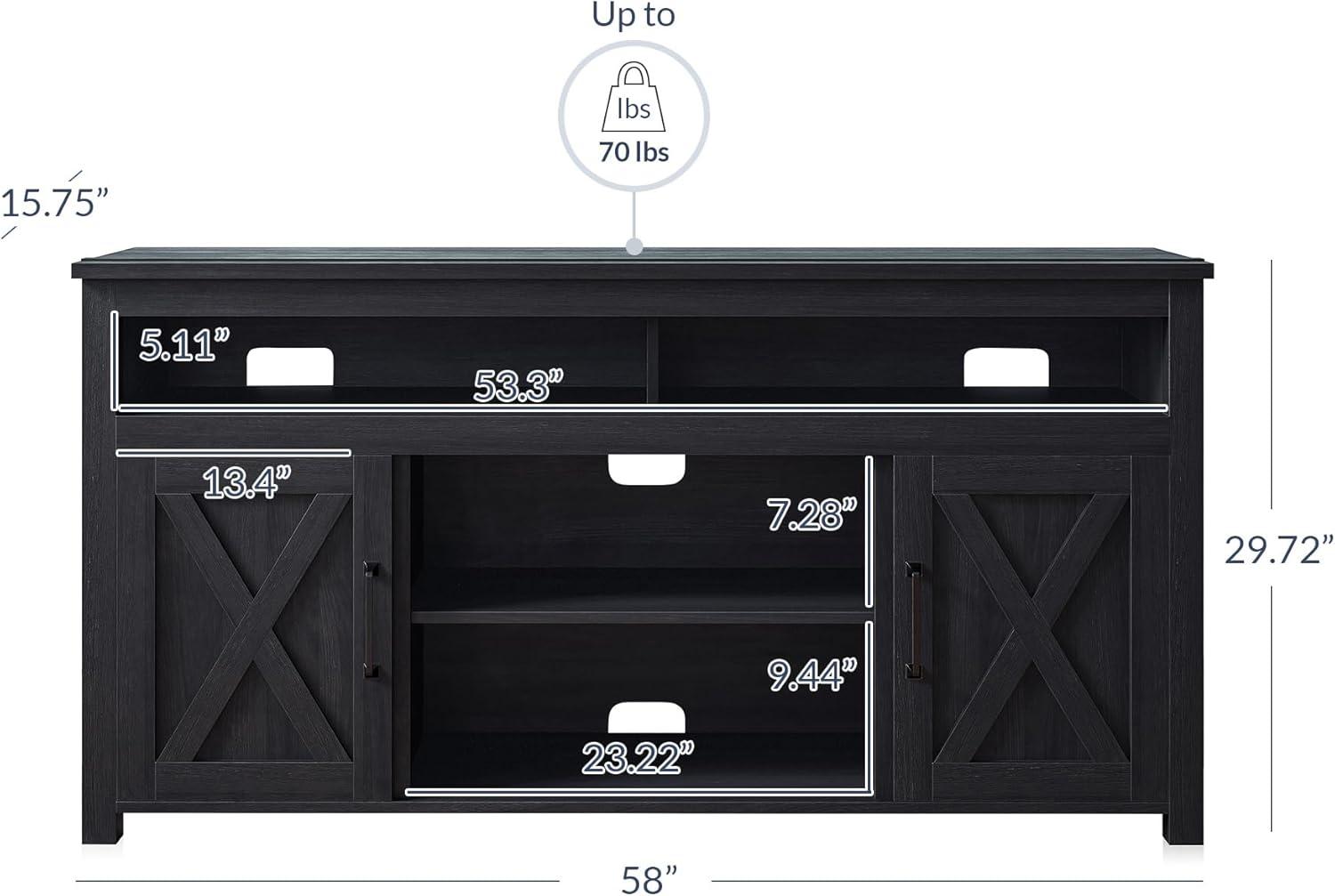 In everyday rooms the stand tends to read as a low, anchoring piece that fills a horizontal span without calling attention to itself; the barn-door detailing adds a textured front that can make the surface look busier when components and décor are added. Because the depth stays relatively modest, the piece often leaves a clear path behind sofas or through narrow living areas, though the doors and cabinet openings can feel constrained in tight alcoves or directly against a wall. Cable access points generally keep most wiring from spilling into sightlines, but component stacks sometimes require shifting to balance access, ventilation and the visual tidy‑up of cords.