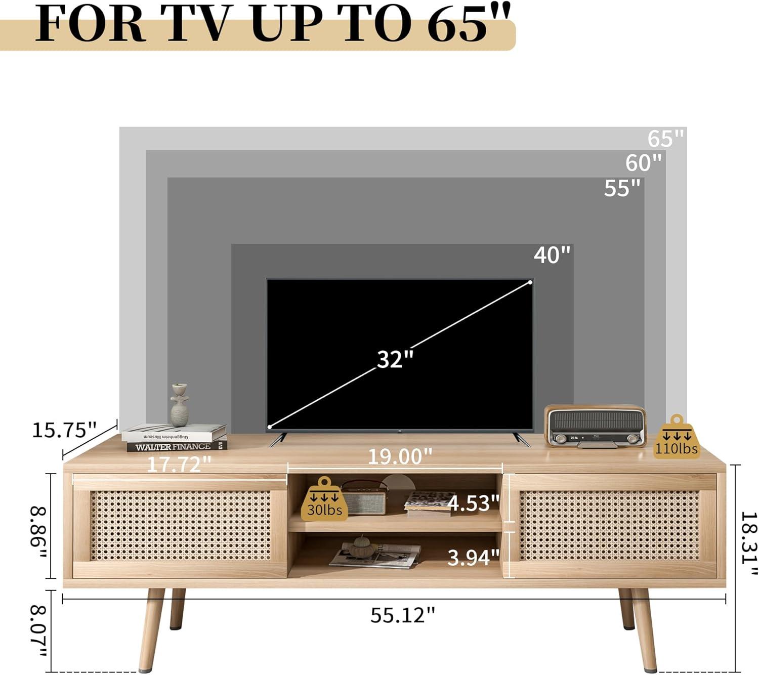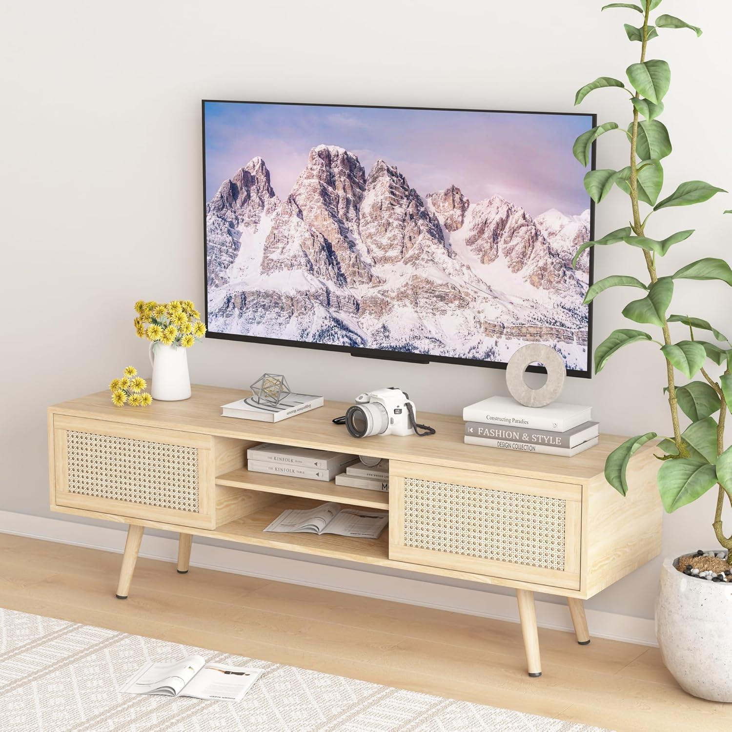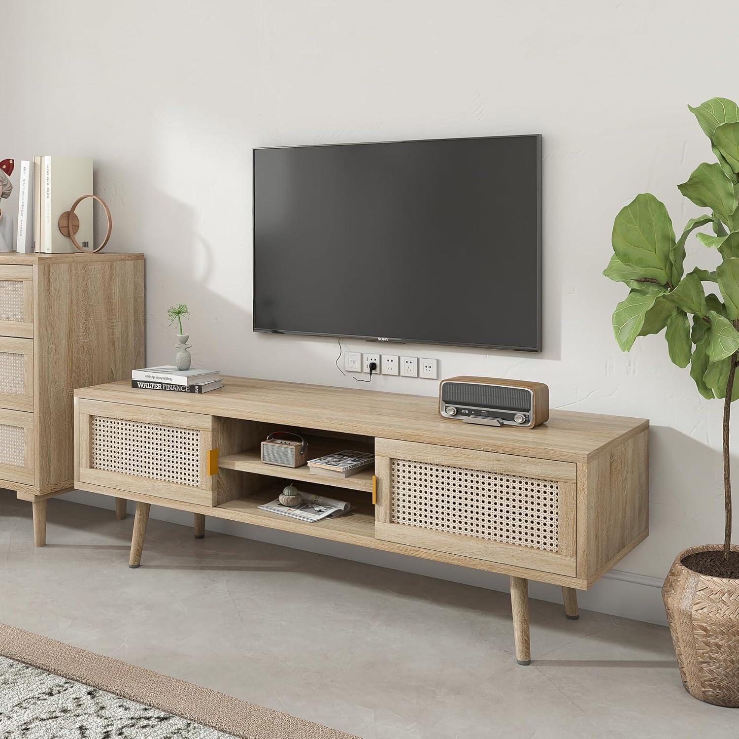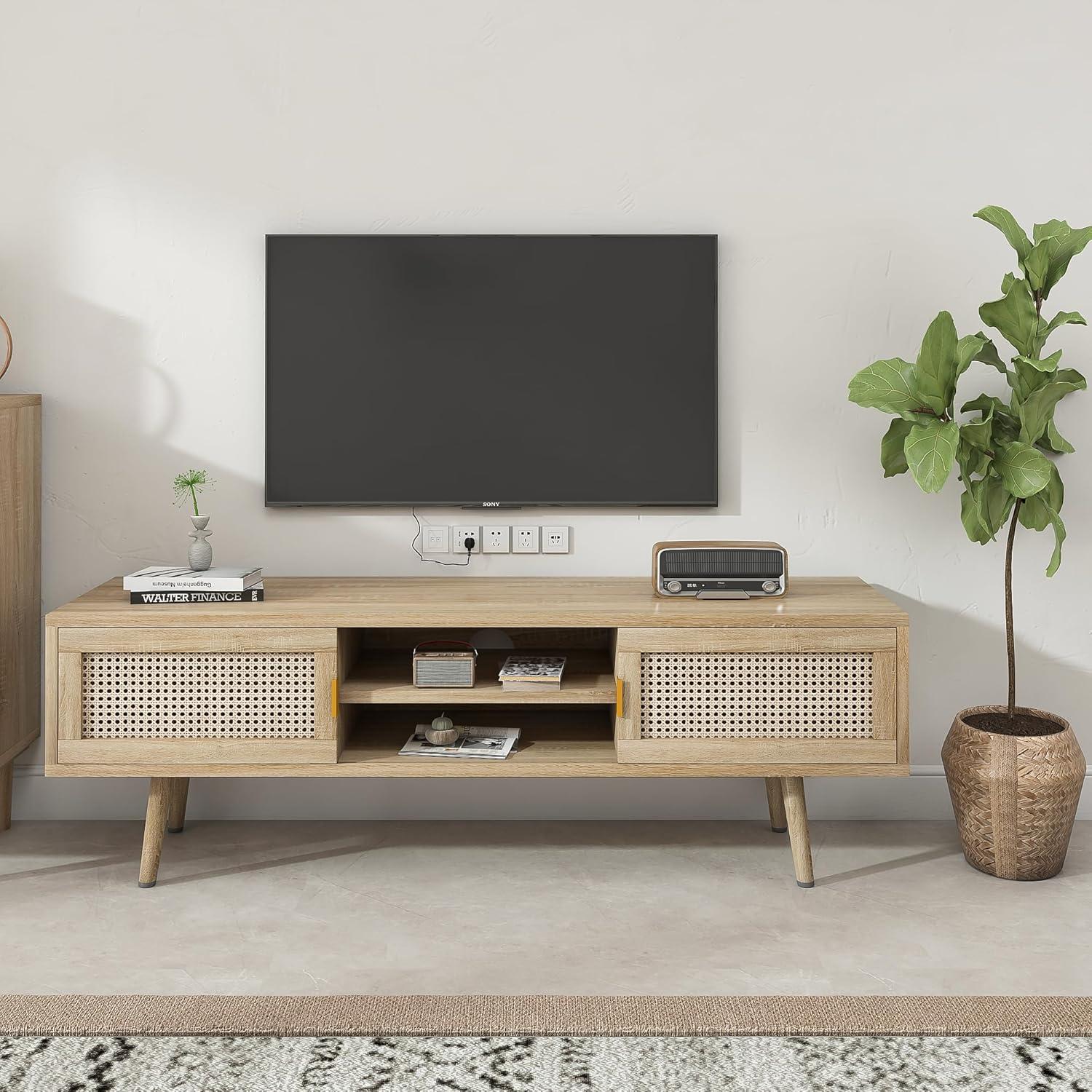 Living with the rattan TV Stand for 55 Inch TV Boho TV Console Media Cabinet with Sliding Rattan Doors Farmhouse Television Stands TV Cabinet Solid Wood Legs entertainment Center TV Console Table for Living Room, you find it slips into the room’s rhythms more than it demands attention, settling into corners of daily life over time. In daily routines you notice its surfaces gathering small marks — a coffee ring, a faint scuff — and how people lean against it or spread a magazine across the top, simple gestures that make it familiar. It gently reshapes how the space is used and how seating arranges itself, its proportions quietly guiding comfort behaviors without fanfare.In your room it simply stays.