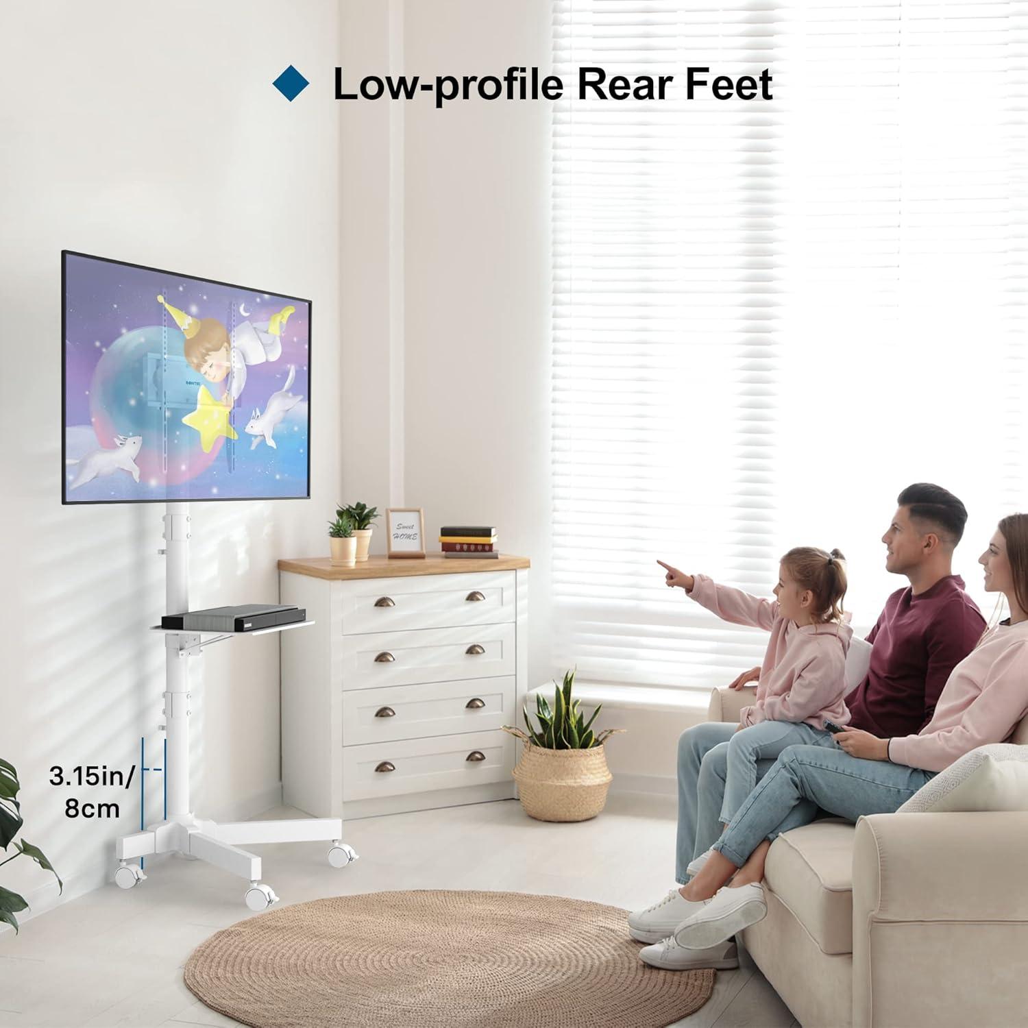 In a typical living room rhythm—moving a screen between seating areas, angling it toward windows in the afternoon, or rolling it outside for a brief gathering—this stand tends to behave like a functional, no-frills piece of AV furniture. Its mobility and small footprint make it easy to tuck behind a sofa or to pull forward for closer viewing; the integrated shelf keeps a streaming stick or small set‑top box in reach without forcing devices to sit on the floor. The following observations summarize how common living-room needs are handled in practice:
