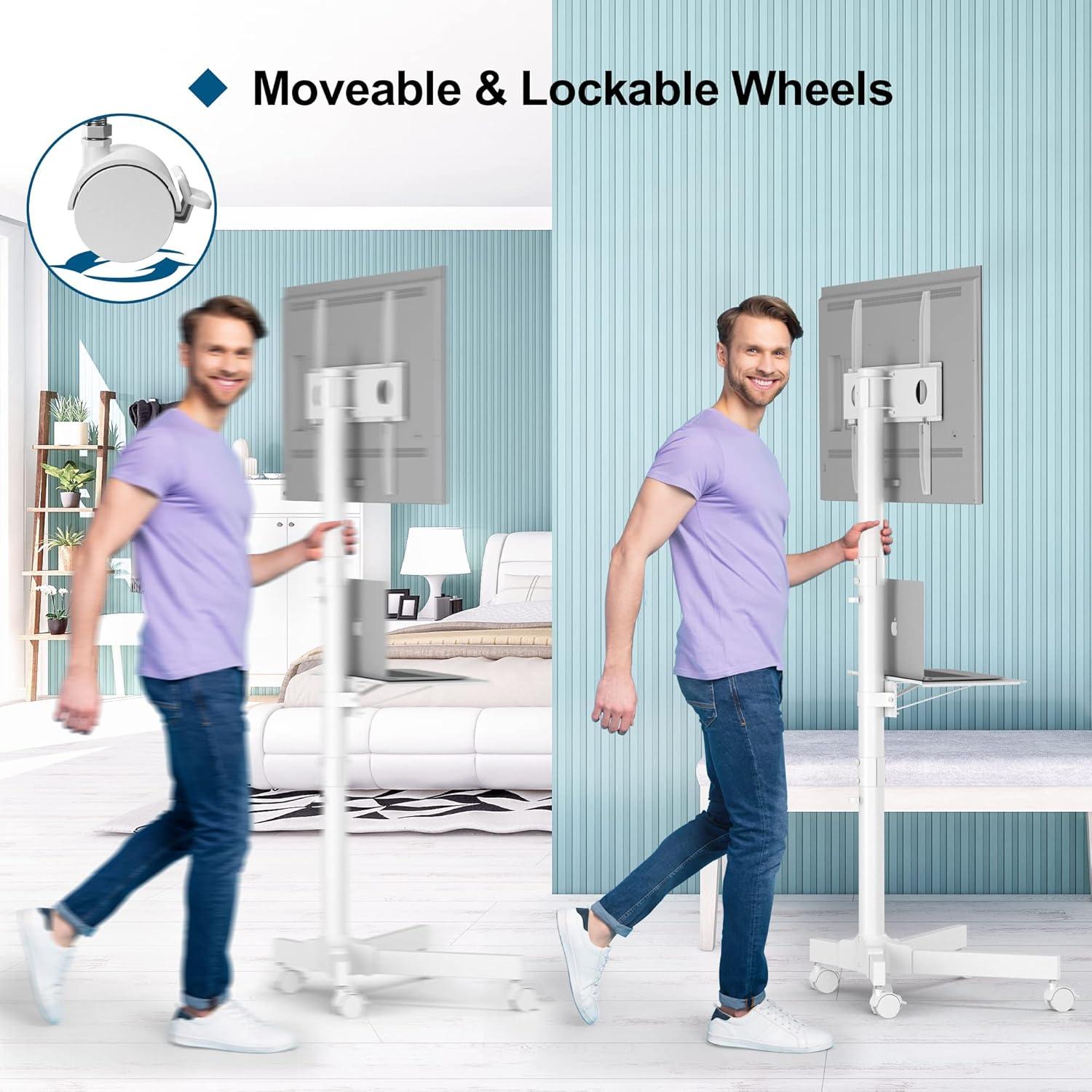 When you move the stand around, it behaves like a piece of furniture you nudge rather than a heavy appliance you carry. A gentle push will roll it across hard floors and low-pile carpet; you’ll find yourself easing it over thresholds or slowing before you hit rugs to avoid a sudden jolt. The casters let you make small, one-handed adjustments to angle and placement — often you’ll stop, click the locks, and then reach back to straighten cables or tweak the screen tilt. In everyday use the motion is habitual: slide it to the foot of the bed for evening TV, nudge it into a corner during a party, or pull it closer to a work surface when you need the screen for a quick video call.