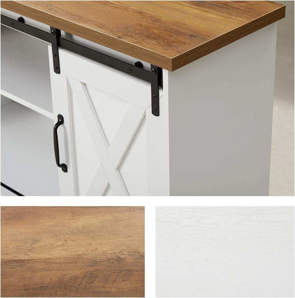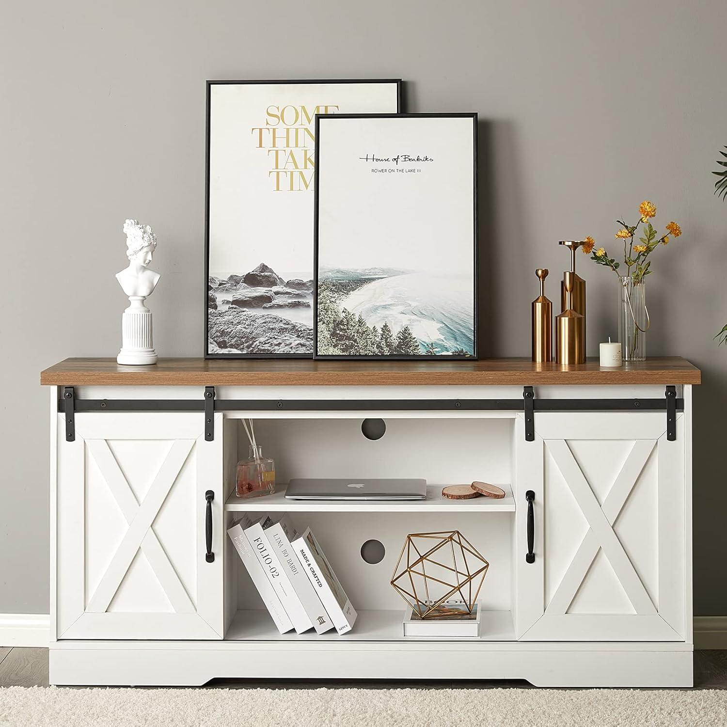 Living with the BonVie Entertainment Stand Sliding Barn Door TV Stand White & Rustic Farmhouse Entertainment Center Adjustable Shelves, Storage Media console for TV Up to 65″ for Living Room, Bedroom, you notice it loosens into the background over time, fitting around the ways the room is used. In daily routines it quietly claims spots for the things that get used most, its surfaces picking up faint marks and the occasional cup ring that come with everyday life. It nudges space usage and comfort behavior into small habits — where to reach for the remote, which shelf becomes the catch-all — and those rhythms make it feel familiar rather than new. After months of moving with your days, it simply stays.