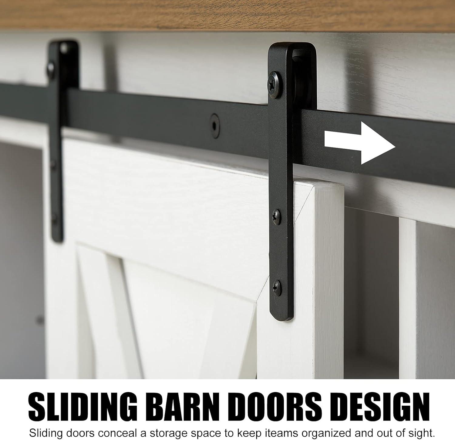 Light lands along the distressed white top and catches the reclaimed-wood grain, a faint roughness under your palm that reads as worn rather than manufactured. You notice the BonVie Entertainment Stand Sliding Barn Door TV Stand (the BonVie barn‑door stand) filling the wall with a confident, horizontal presence that frames the screen without shouting. The black metal track feels solid to the touch as the barn doors glide smoothly, the hardware adding a little industrial rasp when you nudge them aside. Open a door and the interior reveals deep,rearrangeable shelves and a neat cable opening at the back—practical details that show up in everyday use rather than in a spec sheet. From a few paces back the mix of white paint and reclaimed‑wood tones gives the whole piece a lived‑in, farmhouse note that quietly sets the room’s mood.