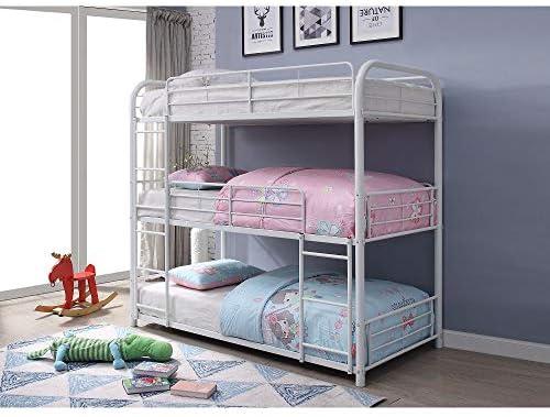 This innovative triple-decker design offers a perfect solution for maximizing space in smaller bedrooms. Crafted from durable metal, the sleek white finish adds a modern touch to any room decor while ensuring long-lasting use. With dimensions measuring 79″ x 42″ x 74″, it securely accommodates three twin-sized mattresses without the need for box springs, providing ample sleeping space. The built-in guardrails offer safety and security, ensuring that kids can sleep soundly. The two front ladders make it easy for children to access their sleeping spaces, promoting independence as they navigate between levels.