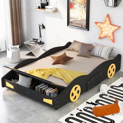 This captivating bed design offers a unique and playful twist that any young racing enthusiast will adore. Constructed from durable pine wood and MDF, it promises stability and long-lasting use. The race car shape includes fun wheels and a visually appealing design, adding excitement to the bedroom while serving as a comfortable sleeping space. Notably, the front of the car cleverly converts to a storage area, making it a practical solution for keeping toys, bedding, and other items neatly organized. The overall dimensions of the bed are a generous 90.6”L x 55.3”W x 15.7”H, and it supports a weight capacity of up to 400lbs.