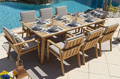 Elevate your outdoor dining experience with a set that showcases a beautiful warm brown tone and is crafted from durable, sustainable eucalyptus wood. The ensemble features a spacious dining table, measuring 86.5″ x 37.5″, complemented by eight armchairs designed for comfort with weather-resistant polyester cushion covers. These cushions, combined with quick-dry foam, ensure year-round outdoor enjoyment, making it perfect for gatherings with friends and family. The aesthetic appeal of the natural materials brings a touch of elegance to any patio setup.
