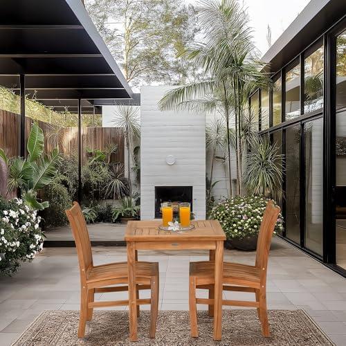 This versatile dining set includes a 27″ square table paired with two elegantly designed Abacho side chairs. Crafted from solid A-grade teak wood, it showcases a rich, natural finish that enhances any patio, deck, or indoor space. The sturdy, contract-grade design ensures durability, making it suitable for both commercial and residential use. Each piece is handmade by skilled artisans, reflecting quality craftsmanship and attention to detail. Not only does it present a chic aesthetic, it also adheres to eco-conscious practices, being made from sustainably sourced teak wood.