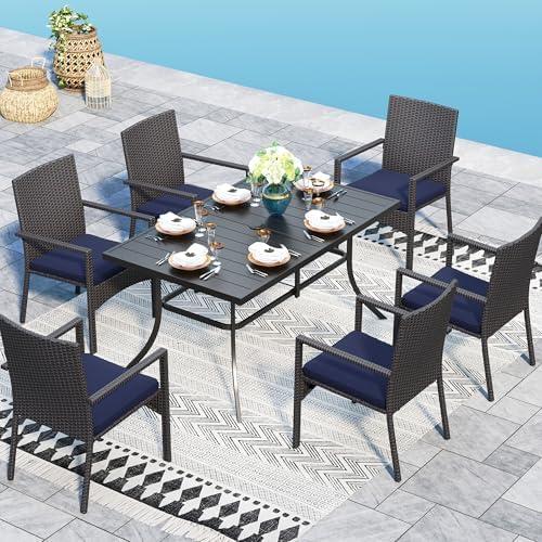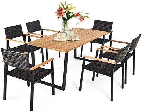 The set comes with six lightweight, rattan chairs that are effortlessly portable, ensuring flexibility in arranging your outdoor space. Each chair is equipped with wide armrests and a slightly inclined backrest, providing ultimate comfort for long gatherings. The weather-resistant rattan and powder-coated steel frame ensure durability against the elements, promising longevity. However, one limitation is that the table can only support a maximum weight of 80 lbs, which may restrict its use for certain types of heavy outdoor dining setups. this dining set is an excellent choice for anyone looking to elevate their outdoor dining experience.