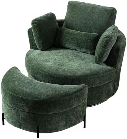 The round accent chair and ottoman set is designed for both comfort and convenience, making it an ideal addition to any living space. Upholstered in soft and durable chenille, this chair offers a cozy spot for lounging or reading, while the ottoman doubles as both a footrest and a storage solution. Featuring a sturdy metal base, it smoothly swivels 360°, making it easy to rotate and engage in conversation or reach for items around you. The four included pillows enhance your comfort, providing lumbar and side support for a relaxed experience.