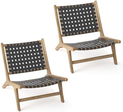Creating a cozy and stylish environment is easily achievable with this set of two accent chairs. The design features a breathable nylon woven backrest and seat that ensures excellent air ventilation, perfect for warm summer days. Built with a high-quality teak wood frame, these armless chairs provide appropriate support thanks to their ergonomic structure, which includes a 115° inclined backrest and wide seat. The addition of a footrest enhances comfort, making them ideal for reading, gaming, or relaxation. Versatile enough for indoor and outdoor use, they seamlessly blend into various spaces, including bedrooms, living rooms, and porches.