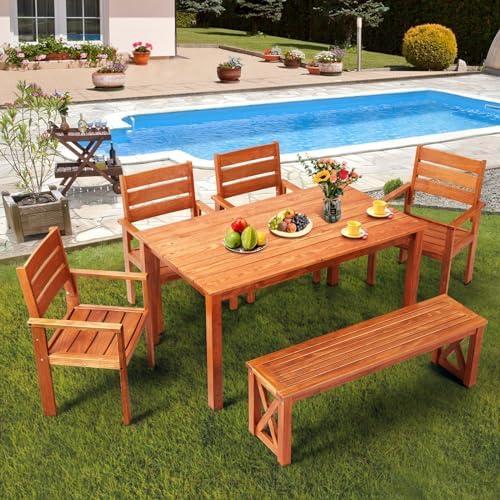 The dining set features a sturdy and spacious wooden table measuring 59 inches in length, 34 inches in width, and 30 inches in height, comfortably accommodating up to six people. Its smooth, waterproof surface not only enhances its appeal but also makes cleaning a breeze. The ergonomically designed wooden chairs come with smooth armrests and backrests, ensuring a comfortable dining experience. The inclusion of a bench adds versatility, promoting intimate family gatherings around the table. This piece is perfect for a variety of settings, whether in the backyard, patio, or even indoors, elevating any dining environment.