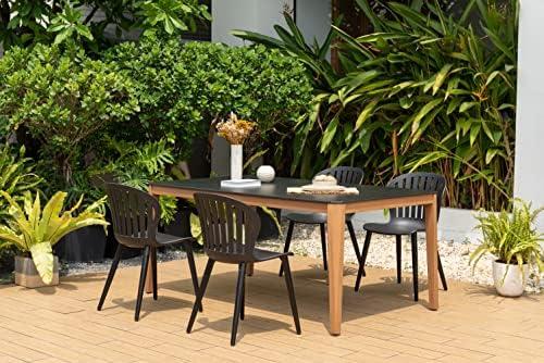 This elegant dining set enhances your outdoor experience with its contemporary design, combining four durable aluminum-framed chairs with a spacious rectangular table made of premium eucalyptus wood. The set’s dimensions (table: 67L x 40W x 30H inches; chairs: 21L x 20.5W x 31.5H inches) offer ample space for family gatherings or entertaining friends. Its lightweight nature ensures easy mobility, while the sturdy construction provides durability, allowing it to withstand various weather conditions throughout the year.