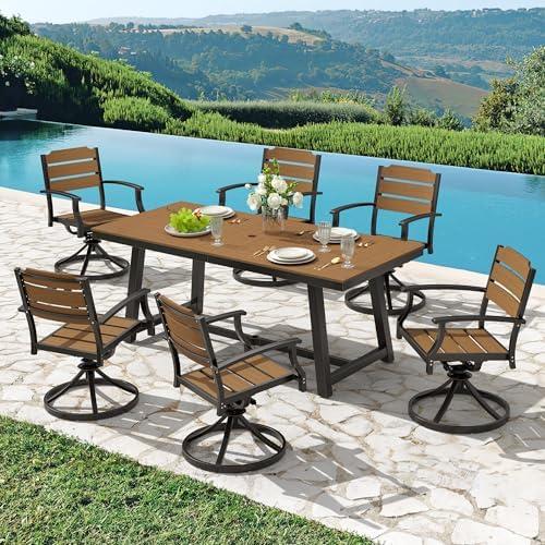 This 7-piece outdoor dining arrangement features a sturdy aluminum frame and high-density polypropylene seat material, offering both durability and comfort. The swivel rocking chairs provide a relaxing experience, with the ability to gently rock while you enjoy your meals outdoors. The set is designed to support weights of up to 280 pounds per chair, ensuring ample seating capacity. Its clean lines and minimalist aesthetic not only enhance your patio or balcony’s appeal but also make it a versatile choice for various outdoor gatherings. Furthermore, the umbrella hole allows for sun protection, making it a practical addition to your outdoor space.