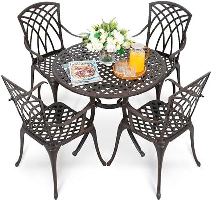 This outdoor dining set boasts a heavy-duty cast aluminum frame with a stylish bronze finish, complete with gold speckles that enhance its aesthetic appeal. The 33-inch round table offers ample space for drinks and food during gatherings, while the included chairs are ergonomically designed for comfort, featuring curved armrests and a supportive backrest. Its materials resist rust and weather damage, ensuring durability and easy maintenance throughout the seasons. A practical 1.97-inch umbrella hole allows for the easy attachment of most umbrellas, providing shade on sunny days or light rain.