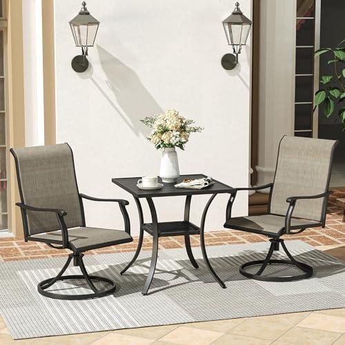 This patio dining set boasts a sturdy metal frame that is treated with a high-performance powder-coating technique, ensuring durability against rust, scratches, and adverse weather conditions. Perfect for various outdoor settings like patios, porches, and backyards, it offers an elegant touch to your outdoor space. The set includes a 28-inch square table and two swivel chairs, making it ideal for intimate dining experiences. The 360-degree swivel feature of the chairs allows for easy mobility and comfortable leisure time, while the breathable Textilene fabric ensures a quick-drying and comfortable seating experience.