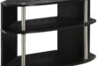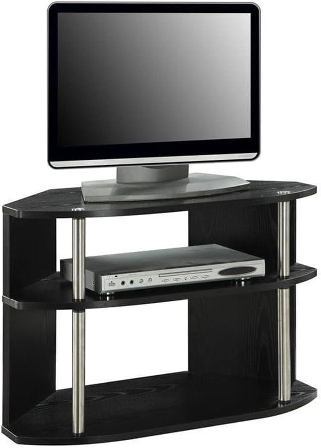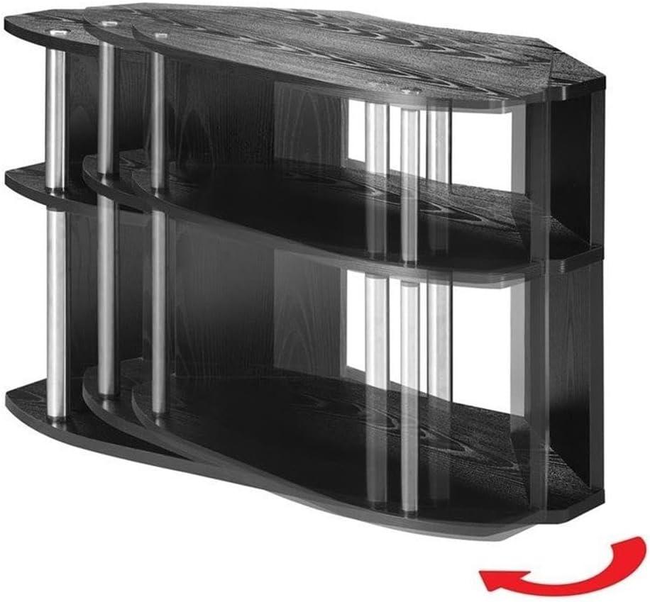 Light from the window skims across the black wood-grain surface and the chrome poles, and when you give the screen a gentle turn the whole unit pivots with a quiet, purposeful spin. The Convenience Concepts Designs2Go Swivel TV Stand — or the Designs2Go swivel, as you’ll likely call it — sits lower than other media pieces; under your hand the faux grain has a subtle texture and the metal posts feel cool and solid. from where you’re standing it reads compact but significant: the dark finish visually anchors the setup while the chrome trims catch the light and break the plane. shelves quietly hold the usual clutter of remotes and a slim streamer, and the swivel subtly changes how the arrangement reads from different seats in the room.